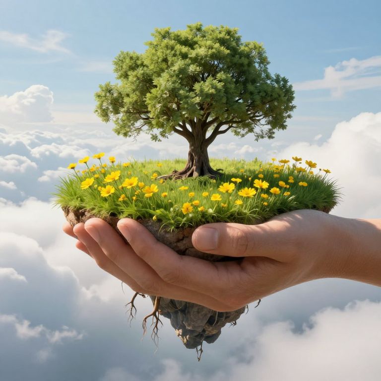 Cradled by colossal hands, a vibrant meadow with a towering tree and blooming yellow flowers defies gravity, its roots extending downward as floating islands drift serenely among fluffy clouds in the background.