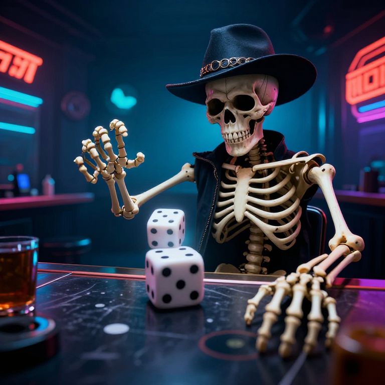 Wide-Angle Image Immersion cyber punk, in pub skeleton with hat playing dice, digital marketing 12k,