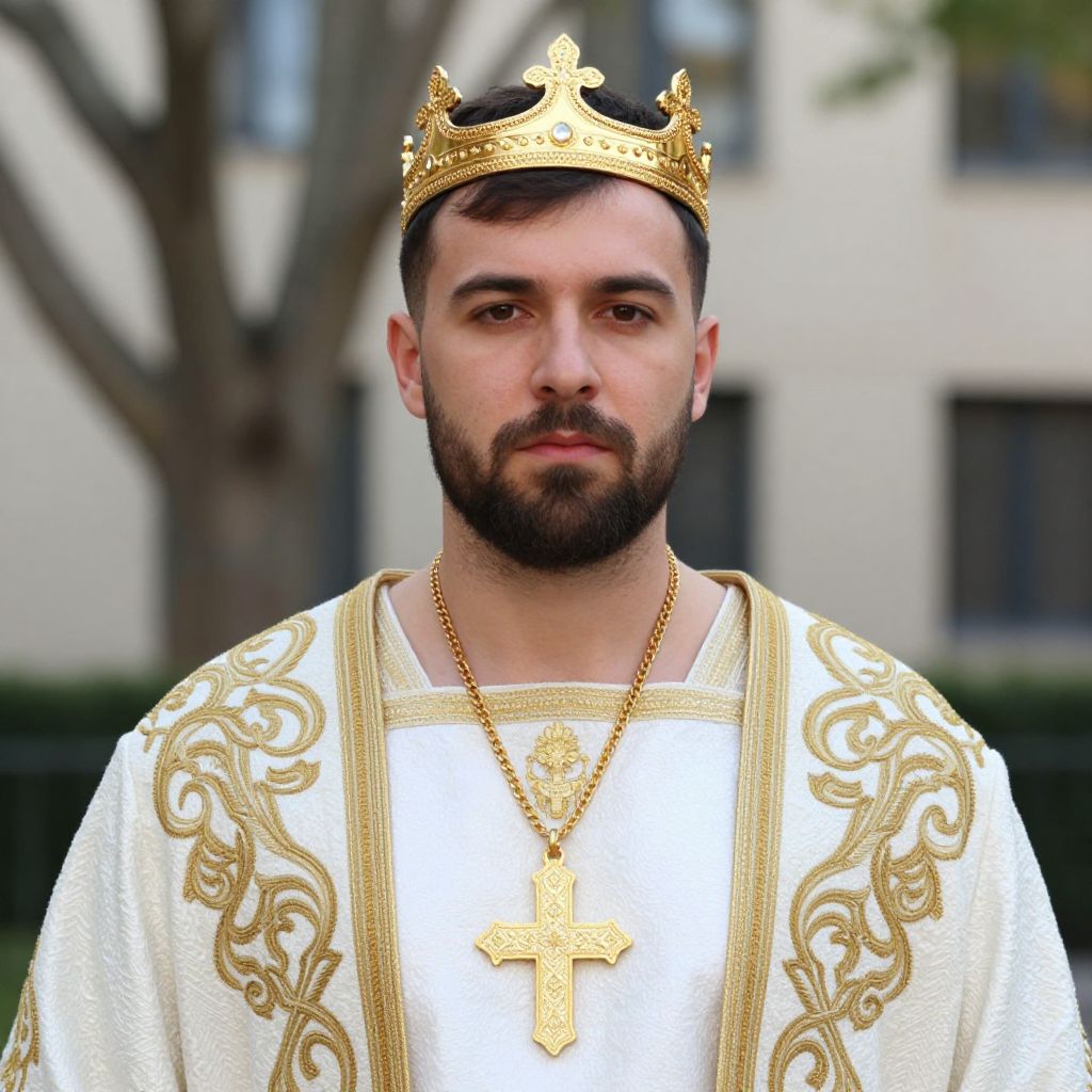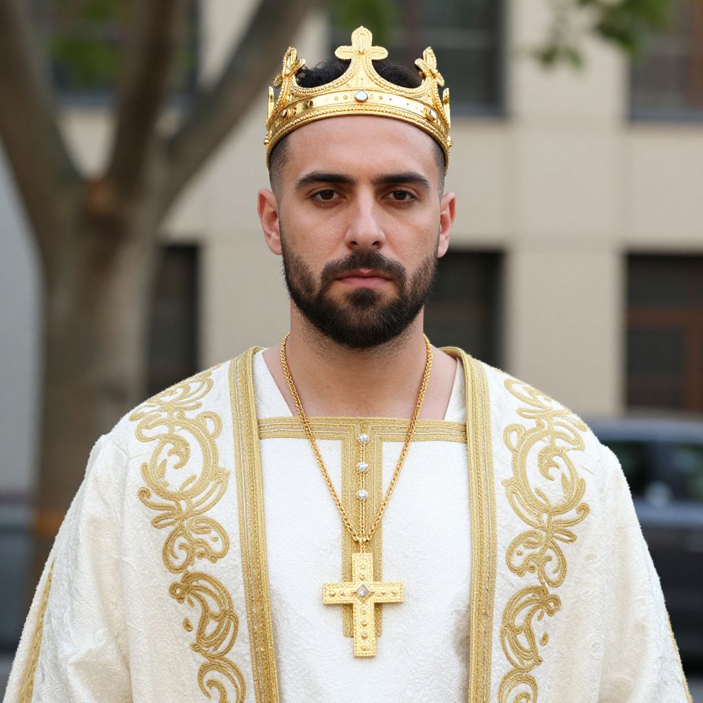 Photograph of a bearded man with dark hair wearing a gold crown and white, ornately embroidered robe with gold trim. He's also sporting a large gold cross necklace. The background is slightly blurred, showing a tree and a beige building with dark windows. He looks straight at the camera with a serious expression. The image has a bright, natural light.