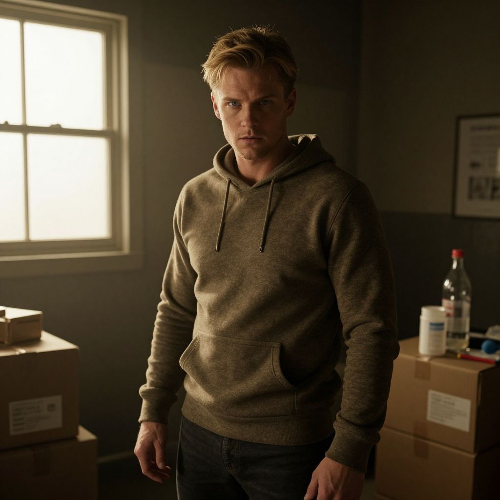 In a dimly lit supply room, a man with short, blonde hair and striking blue eyes stands confidently, his face illuminated by a soft, golden light filtering through a nearby window. He wears a rugged, hooded sweatshirt, the fabric appearing both warm and protective. The room is filled with various boxes and supplies, their contents obscured by the shadows. The man's posture is strong and composed, suggesting a sense of purpose and determination. The overall mood is moody and atmospheric, with the low-lighting adding a sense of depth and intrigue to the scene. The image is a masterpiece, rendered with meticulous detail and a high level of realism, capturing the essence of a grown-up, masculine figure in a dynamic pose.