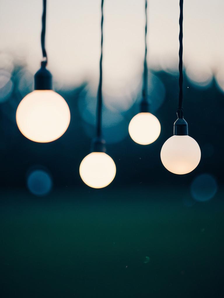 Close-up image of four round glowing light bulbs hanging from black cords outdoors during dusk. The background is softly blurred with bokeh effect, emphasizing the warm and ambient lighting of the bulbs.