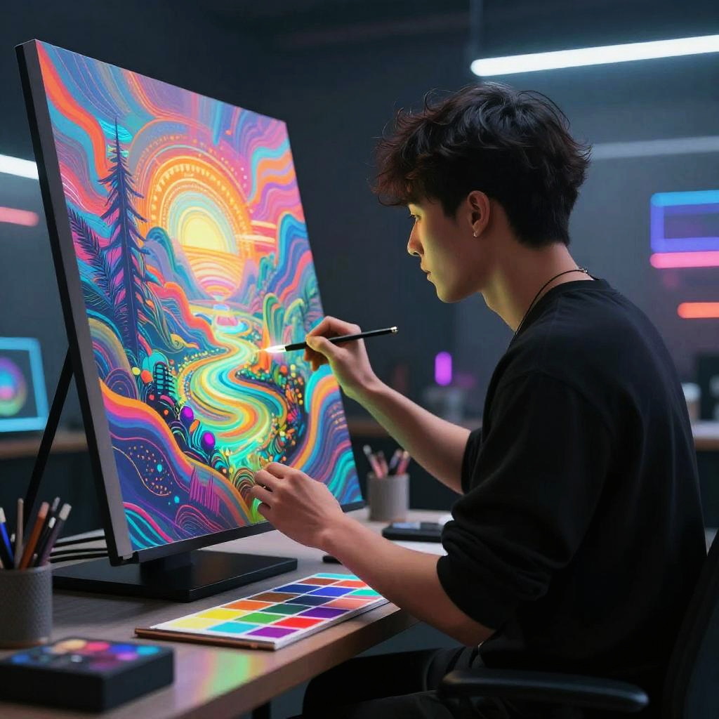Artist.ai concept, futuristic digital artist painting vibrant abstract landscapes in a neon-lit studio, holographic brushes, glowing color palettes, intricate details, cyberpunk ambiance, high-tech creative environment, ultra realistic style