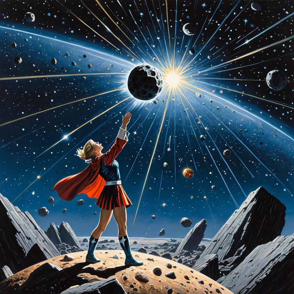 A vibrant surreal painting featuring a large melting clock hanging from a twisted, colorful tree in a dreamlike landscape. The scene includes a reflective pool surrounded by orange and yellow terrain, various unique trees, and a distant house with mountains under a clear blue sky. The image evokes themes of surrealism with rich, vivid colors and high intricate detail.