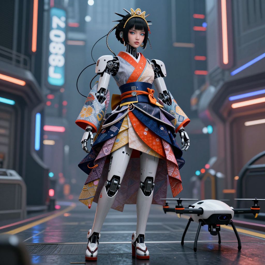 The image depicts a futuristic cyborg robot that resembles the most beautiful woman from the distant future, adorned with intricate makeup that appears to be a blend of traditional and advanced technology. The robot's attire is a striking fusion of Japanese culture and futuristic design, featuring layers of different fabrics that create a visually captivating texture. The overall style is reminiscent of a gundam robot, with a tiara that has cables connecting it to the robot's dress, adding a unique and dynamic element to the design. The robot's bionic eyes are illuminated, giving it a lifelike appearance. Accompanying the robot is a drone companion, enhancing the futuristic ambiance of the scene. The setting is a futuristic street scenario, circa 7088 a.c., with bold and soft lights that highlight the intricate details of the robot's design. The image is captured in a cinematic style, with a full-body view that showcases every single detail of the cyborg robot, from the knees to the top, in an 8k resolution.