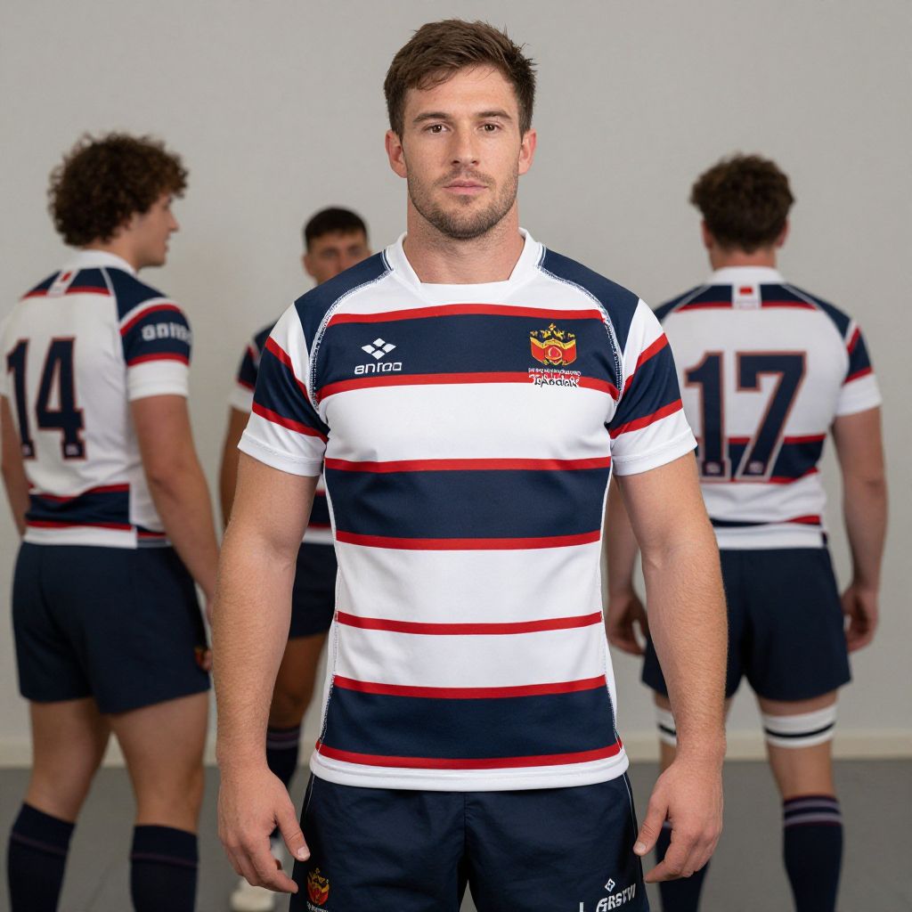 Photograph of a muscular, fair-skinned male rugby player with short brown hair, wearing a navy, white, and red striped jersey, standing in