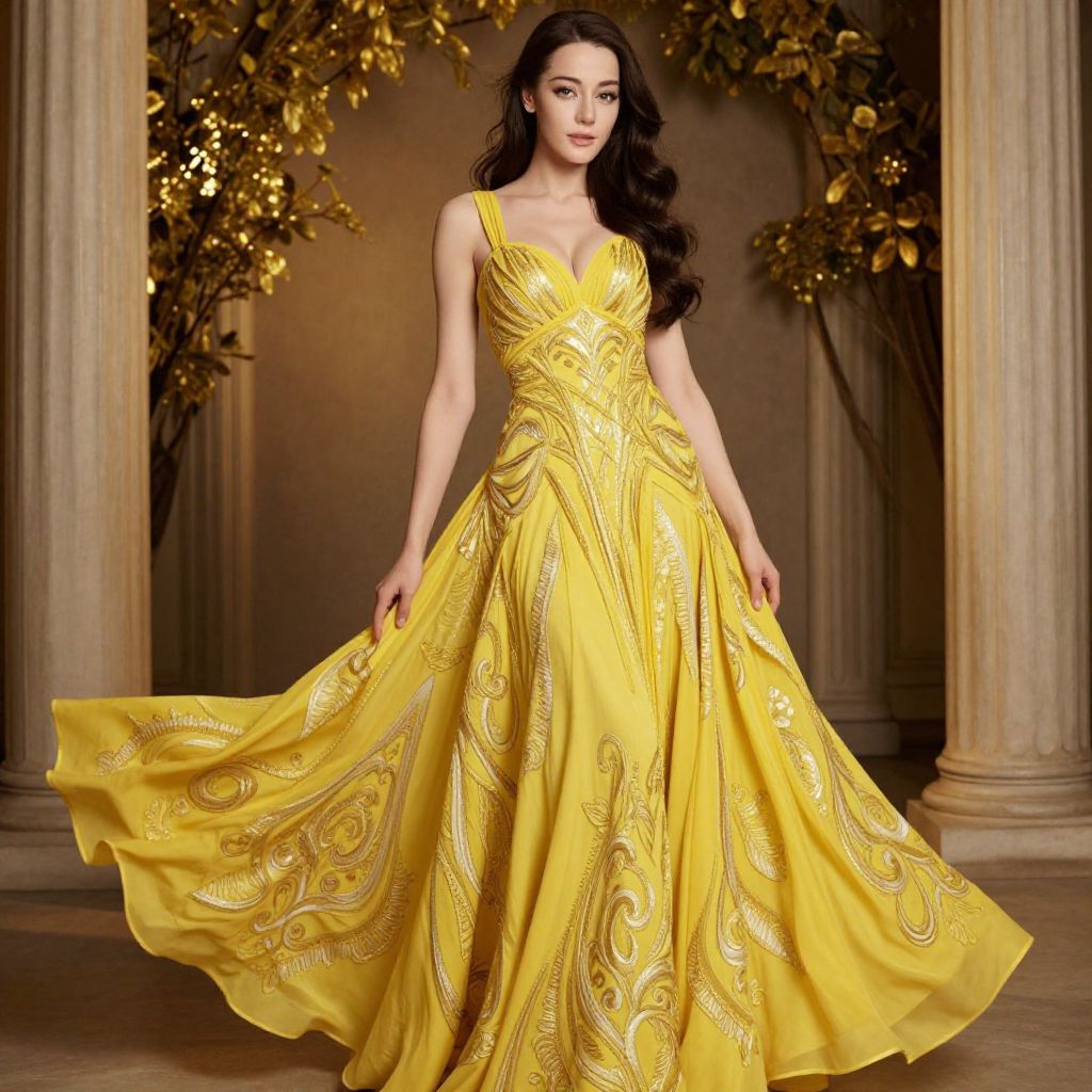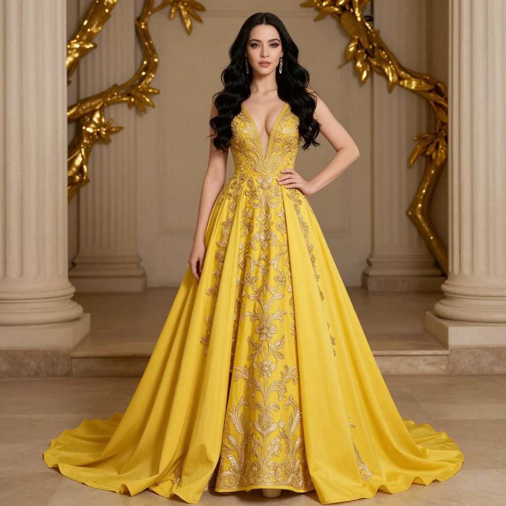 Photograph of a beautiful woman with long, wavy black hair wearing a vibrant yellow, full-length gown with intricate gold embroidery. The dress has a deep V-neck and a flowing, wide skirt. She stands in a grand, classical setting with tall columns and golden, leafy decorations in the background. Her confident stance and elegant pose make her look regal and poised.