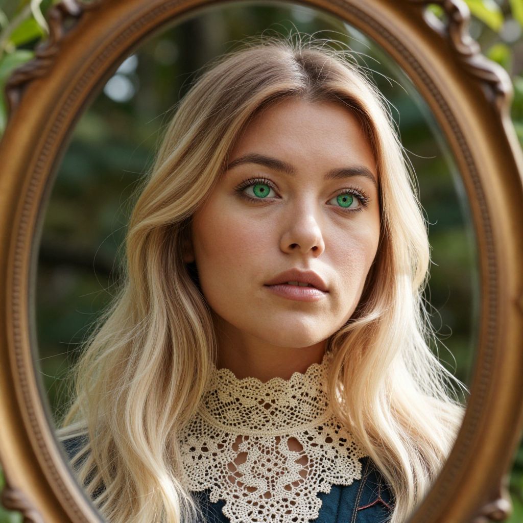 Photograph of a young Caucasian woman with fair skin and striking green eyes, framed by an ornate, oval, golden-brown mirror. She has long, wavy blonde hair and wears a detailed, white lace collar with intricate patterns. Her expression is neutral, with slightly parted lips. The background is softly blurred with green foliage, suggesting an outdoor setting. The lighting highlights her face, creating a natural, soft glow. The mirror's frame has a vintage, decorative style, adding a touch of elegance to the image. The photograph is sharply focused on her face, with a shallow depth of field.