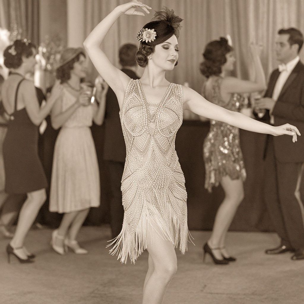 A black-and-white photograph captures a vintage dance scene. A fair-skinned woman with dark hair in an elegant updo, adorned with a flowered headpiece, dances in a fringed, sleeveless, beaded dress. She extends one arm gracefully above her head and the other to the side. In the blurred background, other dancers in 1930s attire, including a woman in a sequined dress and men in suits, are engaged in dance. Curtains hang in the dimly lit room, adding to the nostalgic atmosphere. The image exudes a sense of elegance and timeless grace.