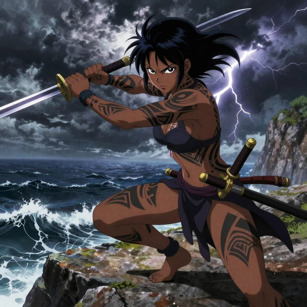 Anime black woman warrior with intricate tribal tattoos, wielding dual swords, positioned on a rocky cliff overlooking a stormy ocean, dramatic sky with dark clouds and lightning, intense facial expression, highly detailed and cinematic anime style.