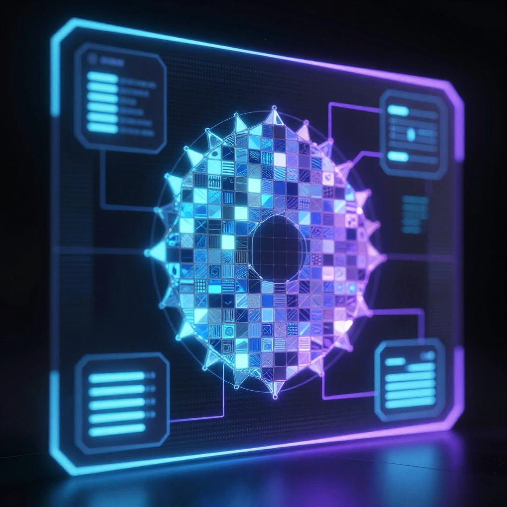 Digital mosaic AI interface, a holographic display of tessellated patterns and AI algorithms in sync, glowing blue and purple hues, sci-fi ambiance, ultra detailed and immersive