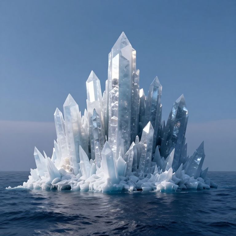 A jagged, crystalline island emerges from the ocean like a frozen symphony, its spiky peaks bathed in ethereal light as if carved from moonlit dreams.