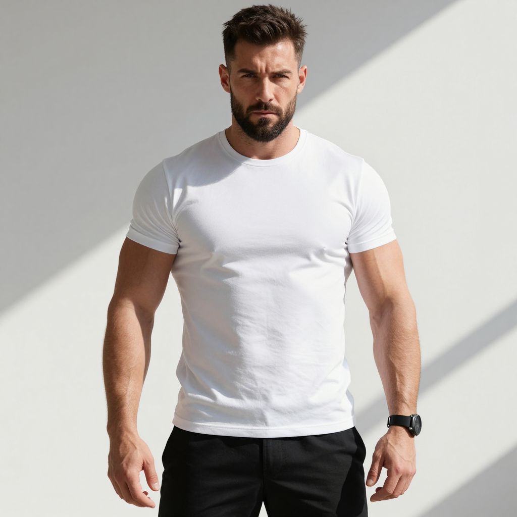 Photograph of a muscular, bearded man with short, dark hair standing in bright sunlight. He's wearing a tight, white, short-sleeve t-shirt that highlights his defined arms and chest, and black pants. His expression is serious, and he has a black wristwatch on his left wrist. The white background is illuminated by diagonal shadows, adding depth to the image.