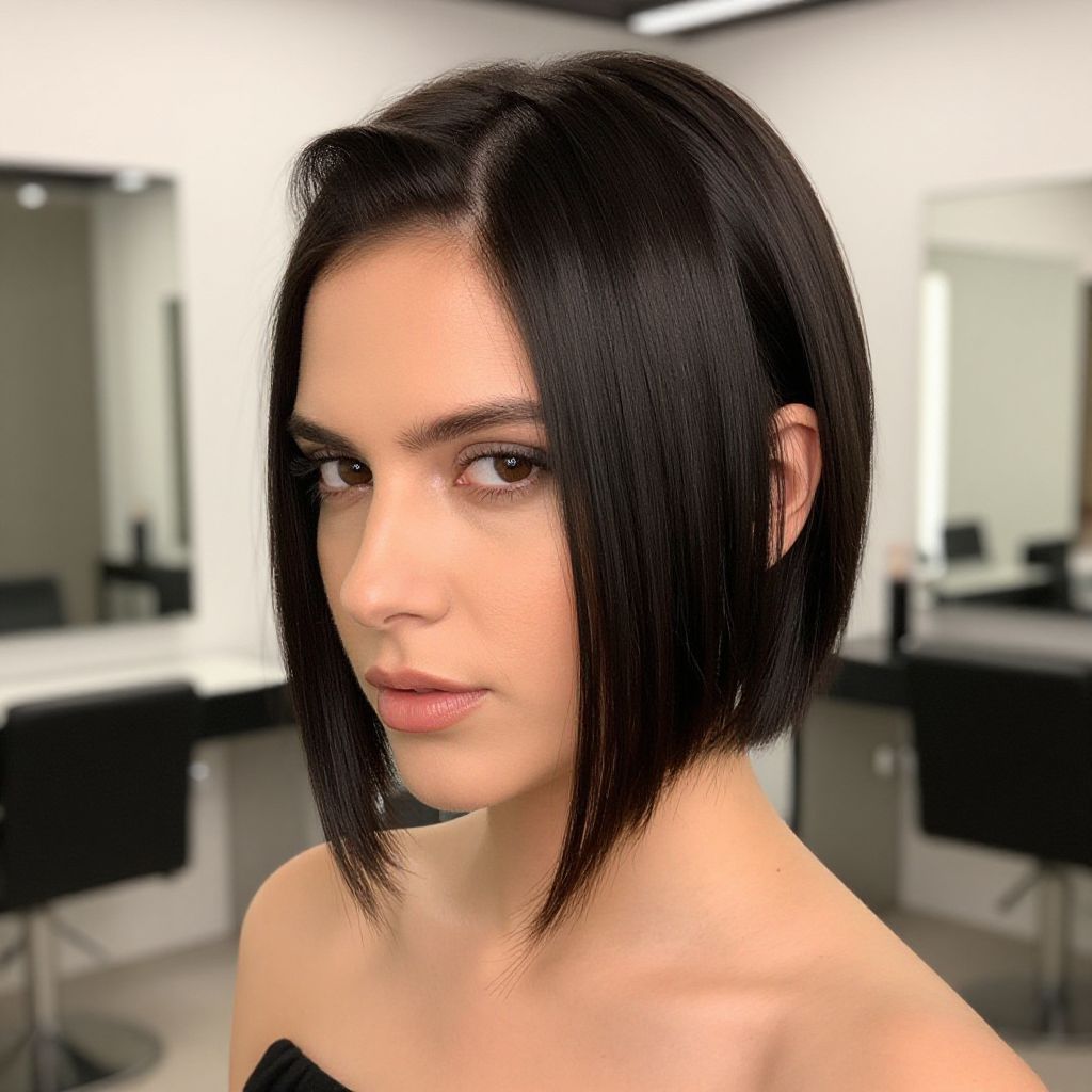 Woman with sleek, high-pitched cut hairstyle in a studio setting, surrounded by mirrors and sleek furniture, clean lines and neutral tones, professional atmosphere, sharp facial features, modern elegance, studio portrait, detailed hair texture, Flux style