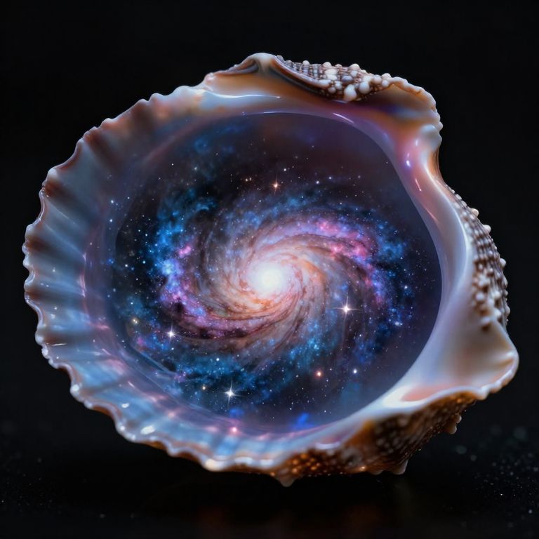 Digital artwork of a glowing, spiral shell with a cosmic, star-filled core against a dark background, blending sea and space elements.