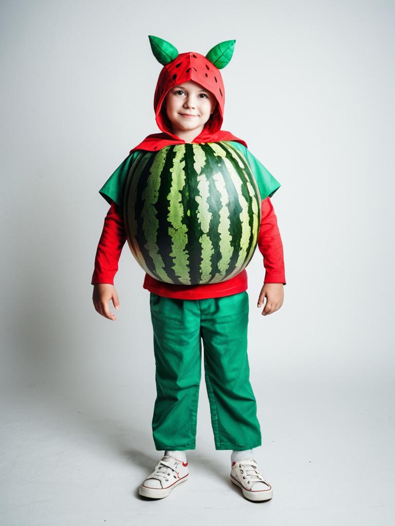 Child Wearing Watermelon Costume Holding Watermelon Slice