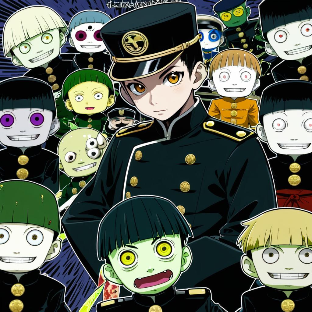 Hanako (jibaku shounen hanako-kun), jibaku shounen hanako-kun, 1boy, hair between eyes, yellow eyes, black hair, short hair, black headwear, black jacket, peaked cap, hat, long sleeves, gakuran, ghost, gakuseibou, gakuran, ofuda, by artist marisasu (marisa0904), anime