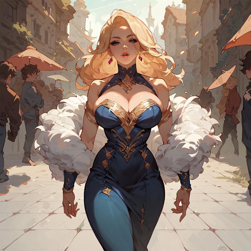 Score_9, score_8_up, score_7_up, (sweeney woman:1.1), portrait, front view, upperbody closeup, walking in the street, wearing refined clothes, looking at the viewer