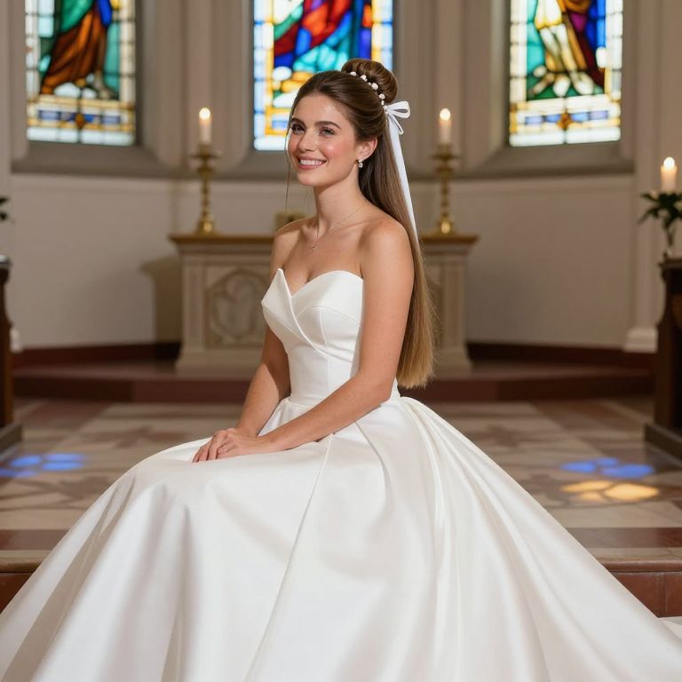 A joyful wedding bride with long, straight hair pulled back into a high chignon with ribbon ties and delicate pearl hair decorations, dressed in a luxurious white and champagne-colored dress with a voluminous train and a structured silhouette, sitting in a candle-lit chapel with stained glass windows casting colorful patterns on the floor, her face serene and joyful, soft blush, freckles, and a natural, glowing tan.