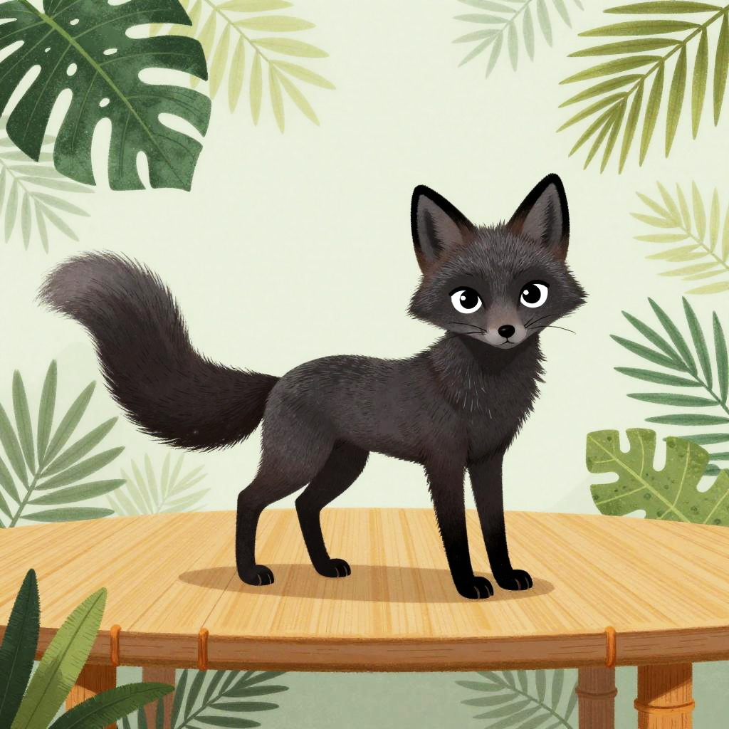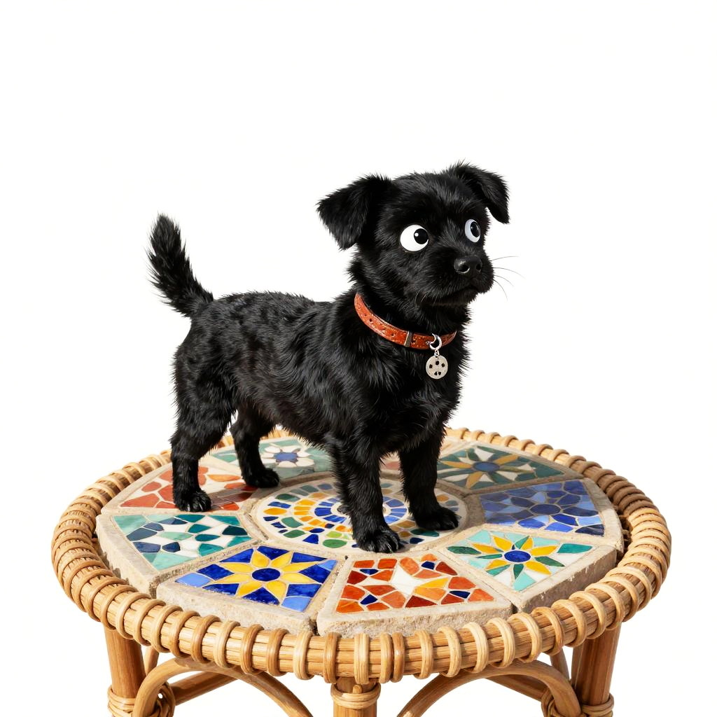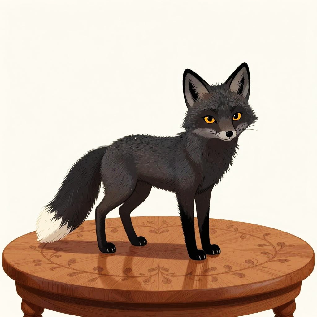 The black beagle on a carved oak table with heritage floral reliefs, in the style of Ferris Plock, charming character illustrations