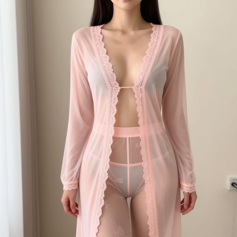 "Sheer mesh cardigan, lightweight fabric, soft pastel pink, open front design, long sleeves, delicate lace trim, matching mesh pants, high-waisted, flowing silhouette, sheer panels, subtle floral embroidery, comfortable fit, perfect for layering.. Sexy. Pretty face and beаutiful eyes. Big breasts."