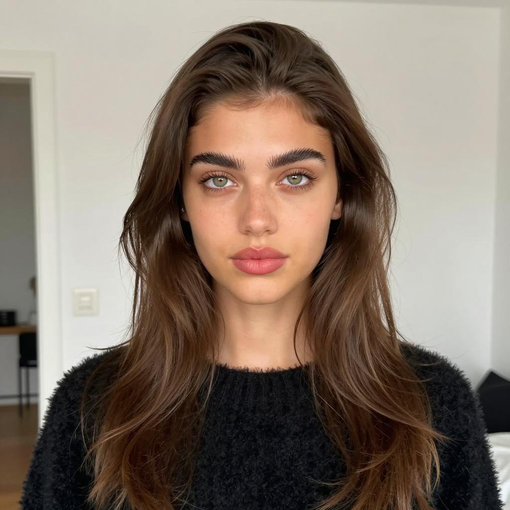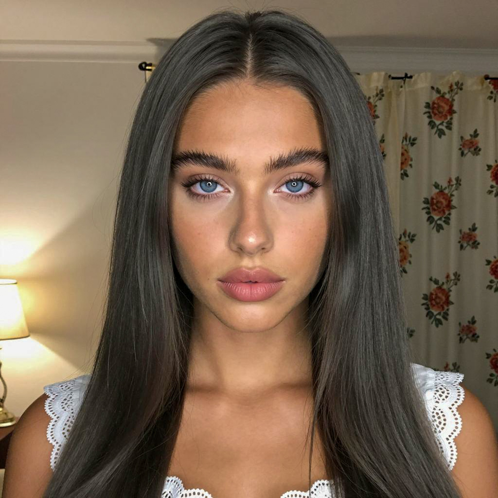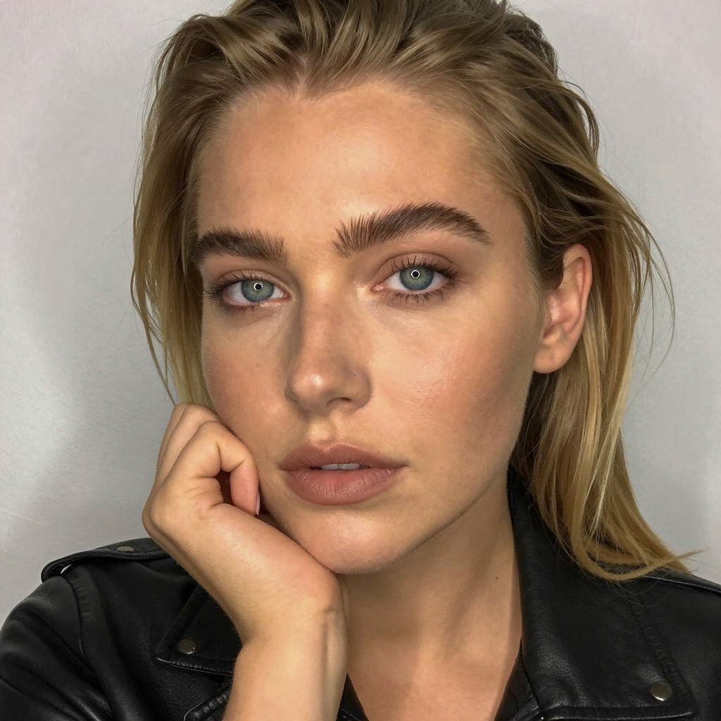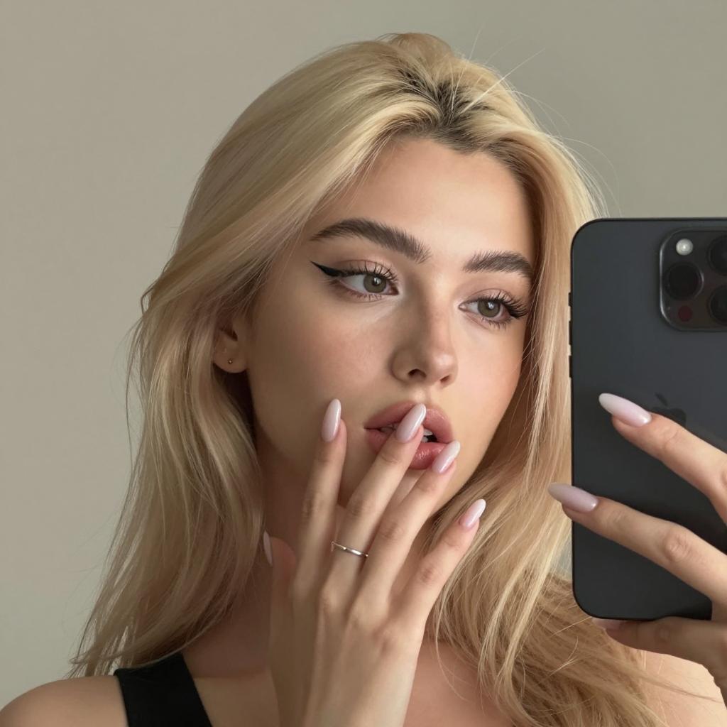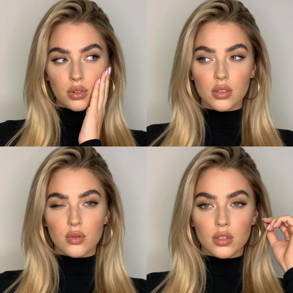 Composite photograph of a blonde woman with long hair, thick eyebrows, and full lips. She wears a black top with a high neck and large gold hoop earrings. Four close-up shots show her looking to the side, touching her cheek, pouting, and adjusting her hair. Her makeup includes defined eyeliner, long lashes, and glossy lips. The background is a plain, light-colored wall.