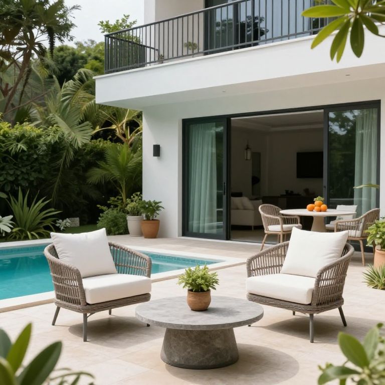 Modern patio featuring two wicker armchairs with white cushions and pillows, positioned around a round stone coffee table holding a potted plant, situated near a rectangular pool with a glass sliding door and green curtains leading indoors, complemented by a second seating area with additional chairs and a dining table set with oranges, all framed by lush greenery and a balcony above.