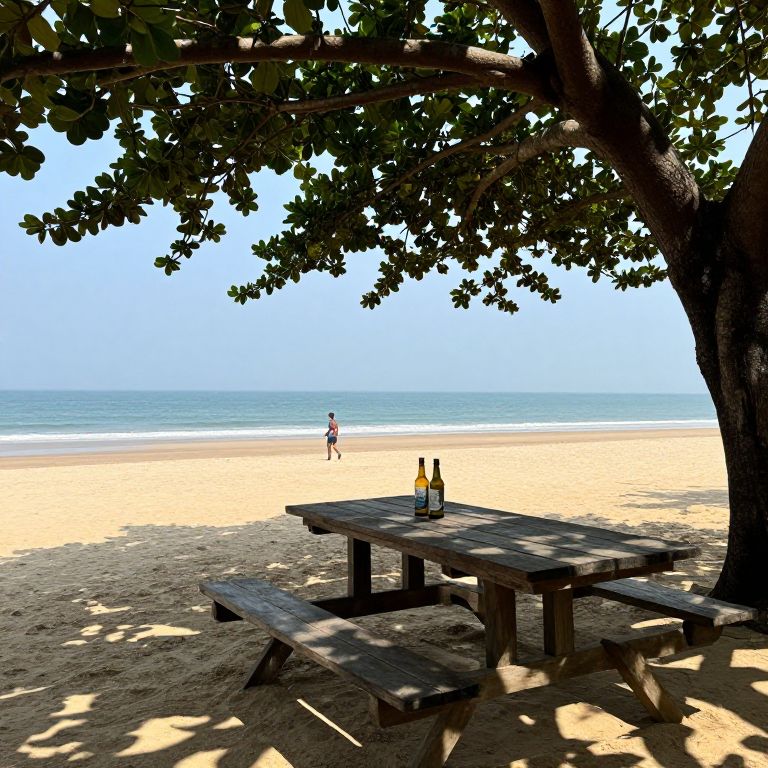 Indian Beach offers a serene picnic spot under a sprawling tree, featuring a wooden table shaded by its branches, two bottles placed atop, and a lone figure walking along the sandy shore near the tranquil ocean.