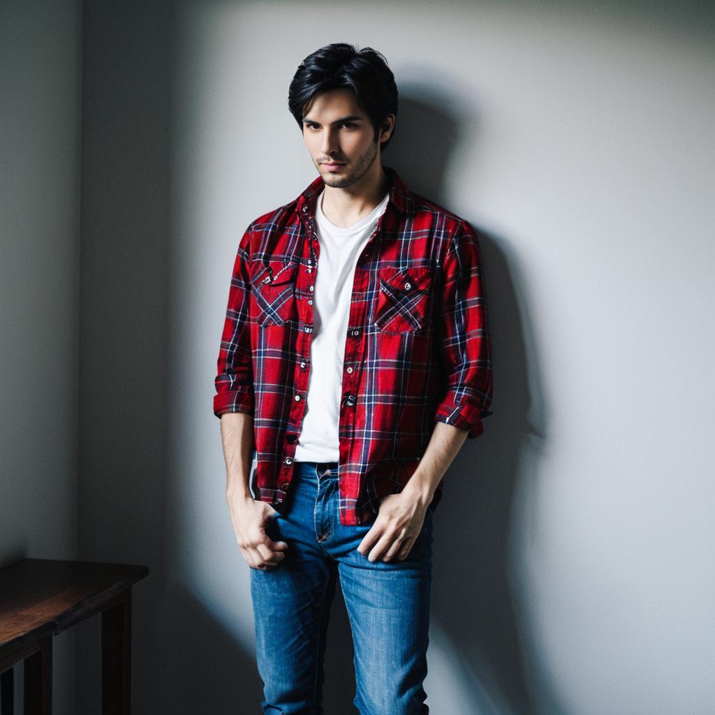 Portrait of a young man with short dark hair wearing an unbuttoned red and navy blue plaid shirt over a white undershirt, paired with blue jeans. He stands against a plain light gray wall with hands in pockets, exhibiting a casual and relaxed pose.