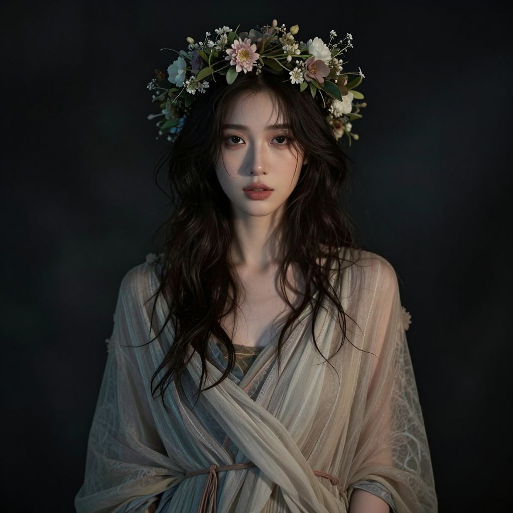 A woman adorned with a floral crown and draped in a flowing garment, set against a dark, enigmatic background.