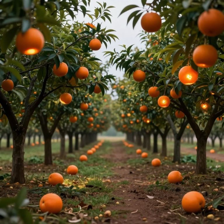 A surreal orchard stretches into the distance, its trees adorned with luminous orange fruits that defy gravity, some suspended mid-air while others rest mysteriously on the ground, creating an otherworldly pathway of forgotten dreams.