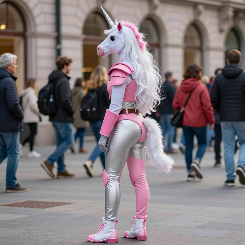 Unicorn carnival costume, photograph of a person wearing a unicorn costume, standing in a busy urban street, daytime, person has long white hair, pink and silver unicorn horns, pink shoulder armor, pink and silver tight pants, brown belt, white and pink high-top shoes, white tail, people in background, stone buildings, arched windows, colorful clothes, casual attire, realistic style, urban setting, detailed ures, natural light, slightly blurred background, focus on costume