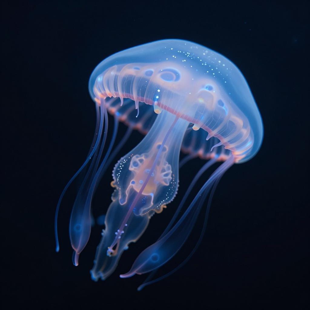 Digital photo of bioluminescent deep-sea jelly fish alien in glowing underwater caves on Europa, showcasing skin textures like translucent electric blue pulsating membranes with shimmering fractal patterns. Captured in Professional Wildlife Photography style, ultra HD, realistic outer space wildlife portrait with shallow depth of field and dramatic lighting.