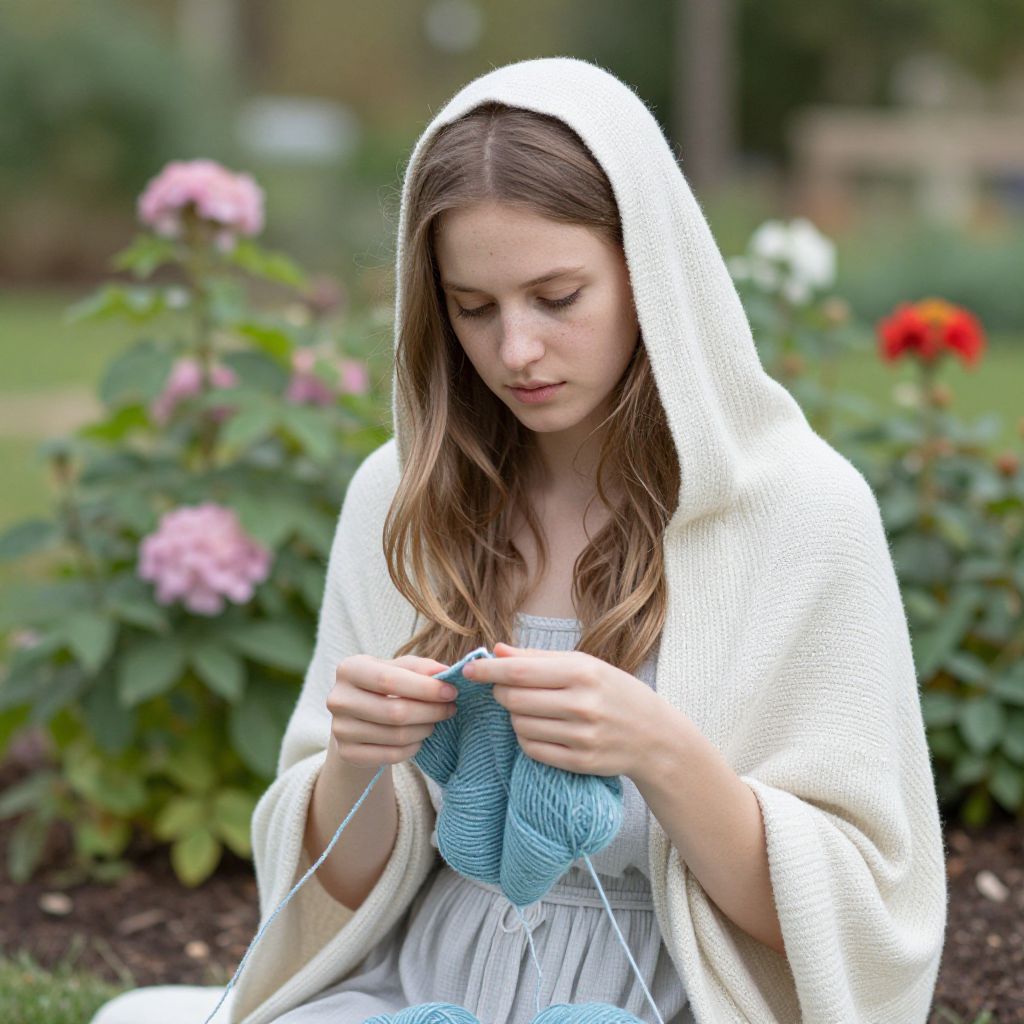 Serenity and introspection intertwine as a young woman, cloaked in the soft embrace of a garden's gentle whispers, finds solace in the rhythmic dance of her hands, weaving threads of purpose amidst the vibrant tapestry of life.
