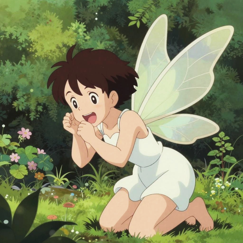 Realistic photo.a mischievous fairy, with delicate wings and a twinkling smile, causing playful trouble in a lush garden, depicted in the comedic and nostalgic anime style of Motoo Abiko. realistic photo