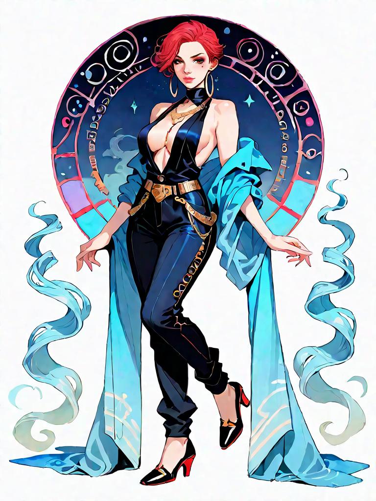 Digital artwork of a confident woman in a dark fantasy setting at night, featuring a plunging neckline fitted black jumpsuit with gold chain belt and wide leg trousers. She has a sleek bob hairstyle with deep red hair, oversized hoop earrings, red pumps, and a flowing light blue cape with ethereal smoky effects. The background is a circular mystical design with astrological symbols, suggesting a magical or supernatural theme.