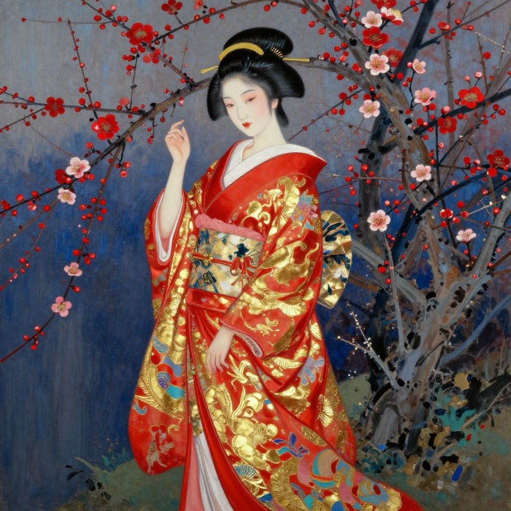 Chromolithograph kitri in asian face, bright red dress, with a spanish fan, a painting by mary cassatt, impressionism,