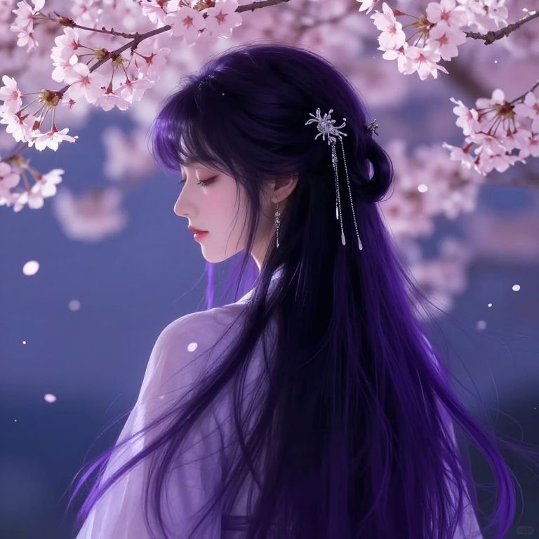 Purple hair outfit, elegant fantasy setting, flowing silk gown with intricate embroidery, soft glowing magical orbs floating around, ethereal forest backdrop, delicate floral crown, dreamy color palette with purples and soft pinks, soft focus