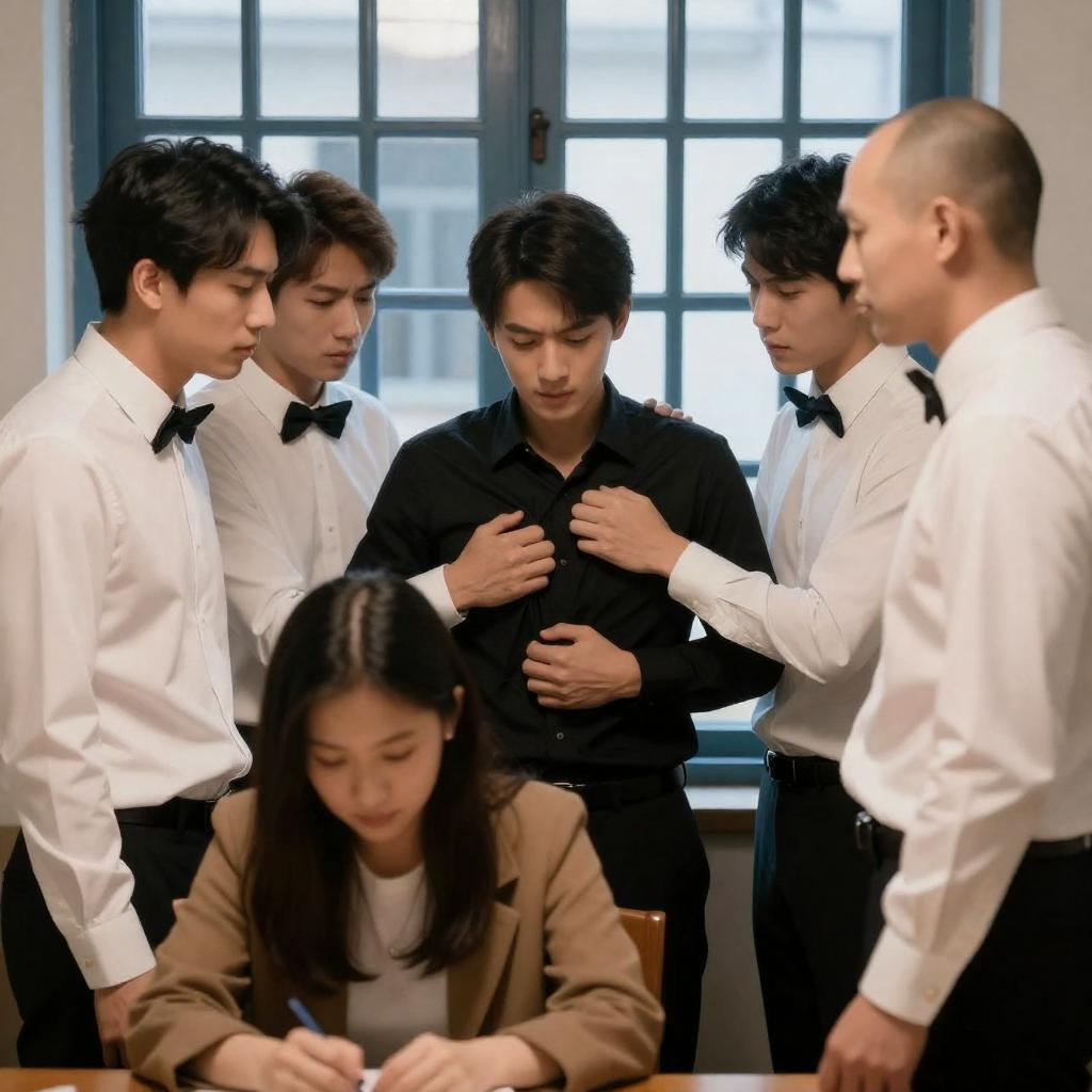 Photograph of four people in a backyard. Two men in white shirts and plaid pants stand over a woman in a pink dress lying on the ground, with a third man in a white shirt and tie kneeling beside her. Ski poles and ropes are in the background. The woman appears distressed, with one man holding her arm and the other two observing.