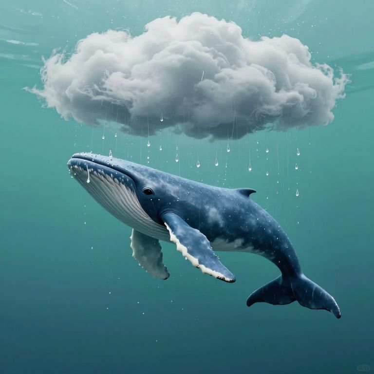Photorealistic digital artwork depicting a massive blue whale with a gray and white patterned body, swimming underwater. Above the whale, a white, fluffy cloud floats with water droplets falling from it. The background is a gradient of blue shades, representing the ocean's depth. The whale's mouth is slightly open, and its eyes are visible. The image combines elements of realism and surrealism, creating an imaginative underwater scene. Light filters through the water, highlighting the whale's textured skin and the cloud's softness.