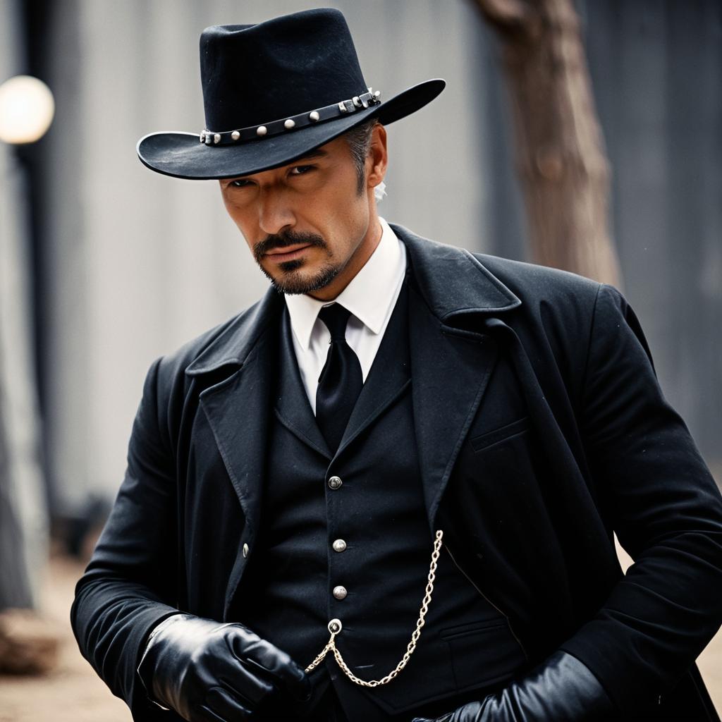 Sharp-featured man with narrow eyes dressed in a black cowboy hat, dark duster coat, black vest, white shirt, and black tie. He wears a white glove on his raised hand and has slicked-back dark hair with gray highlights. The background features an outdoor bokeh effect with trees.