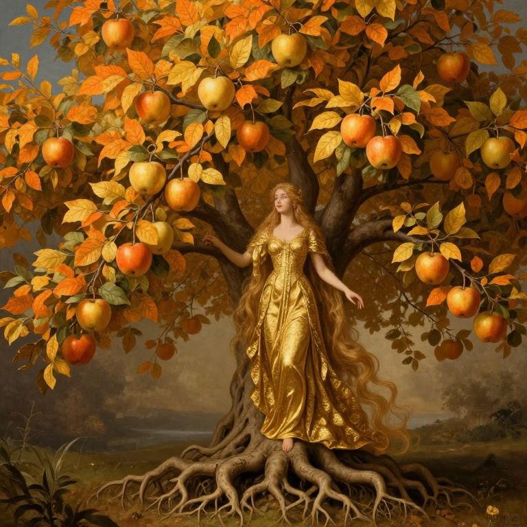 The image depicts a richly detailed, mythological landscape scene featuring a golden apple tree, reminiscent of the style of artists such as Donato Giancola, Anato Finnstark, and Brad Kunkle. The tree, adorned with vibrant orange and yellow leaves, is the central focus, its branches extending outward in a natural, organic manner. The apples, varying in shades of gold and orange, hang from the branches, adding a sense of abundance and fantasy to the scene. The tree's roots, intricately intertwined, extend downward, grounding the composition and adding depth to the image. The figure, dressed in an elaborate, golden gown with intricate patterns, stands gracefully among the branches, her long, flowing hair cascading down, blending seamlessly with the tree's foliage. The overall composition is balanced, with the figure and tree occupying the central space, while the surrounding elements, such as the apples and leaves, create a harmonious and visually engaging scene. The use of warm, earthy tones and the detailed textures of the leaves, apples, and roots contribute to the photorealistic quality of the illustration, making it a captivating piece of folklore art.