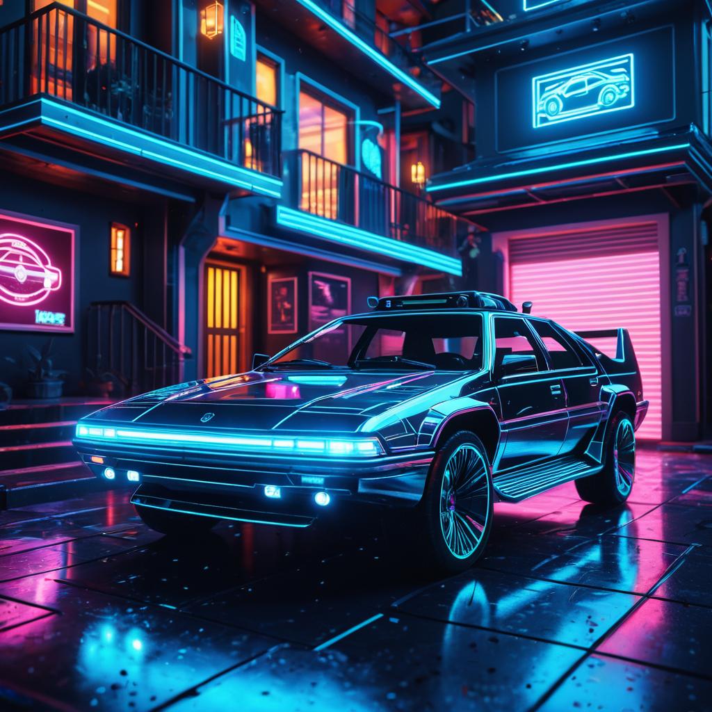 A highly detailed, neon-lit sci-fi scene featuring a classic styled hover car with glowing neon pink and blue accents, floating above a dark urban street. The street is surrounded by futuristic buildings with holographic advertisements and vibrant neon signs. The atmosphere is enhanced by a glowing holographic staircase above the hover car, creating a visually captivating cyberpunk environment.