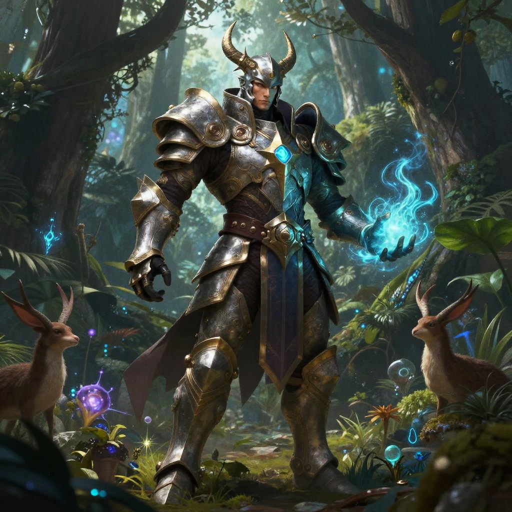 Legend of runeterra art illustrating a mythical forest guardian with legendary armor and elemental magic, lush background with enchanted flora and fauna, strong contrast lighting, epic fantasy vibe, highly detailed character texture and environment