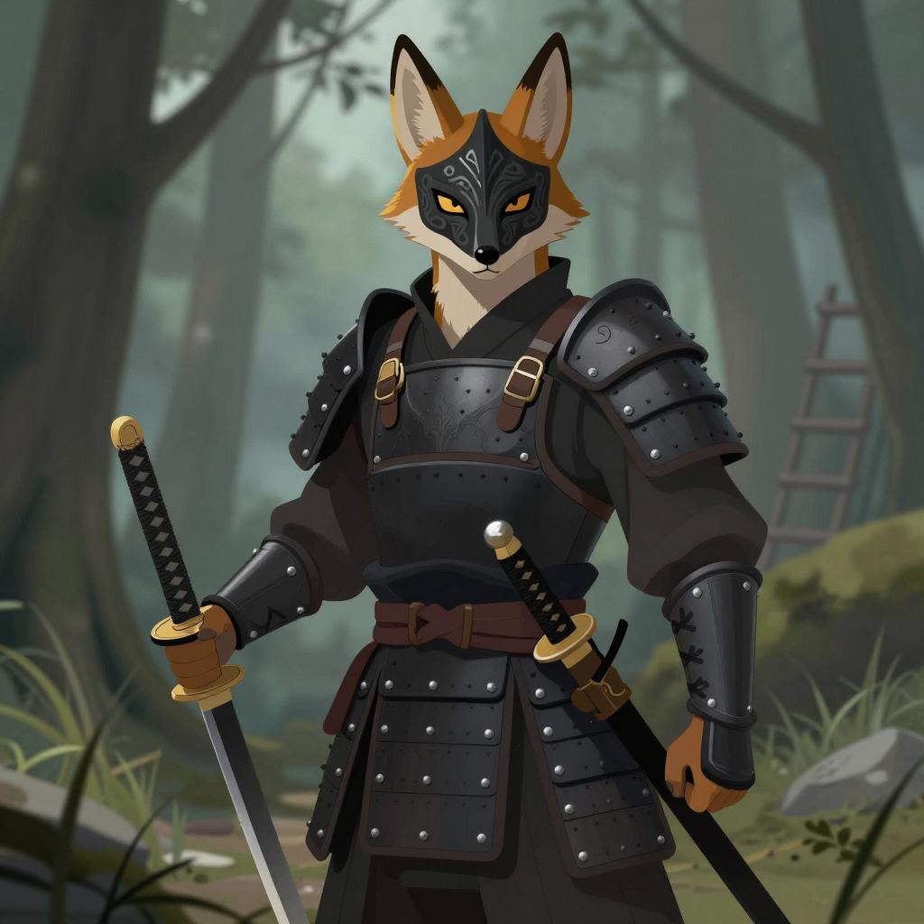 Illustration of a fox humanoid with a fox mask, wearing a detailed black kimono with red and green patterns. Fox has a serious expression, holding a wooden pipe in its mouth. Two Japanese lanterns with intricate designs hang above. Several katana swords are crossed in the background. A red umbrella with white stripes is at the top. The fox's head is turned to the side. Two large ropes with wooden ends are tied around the fox's neck.