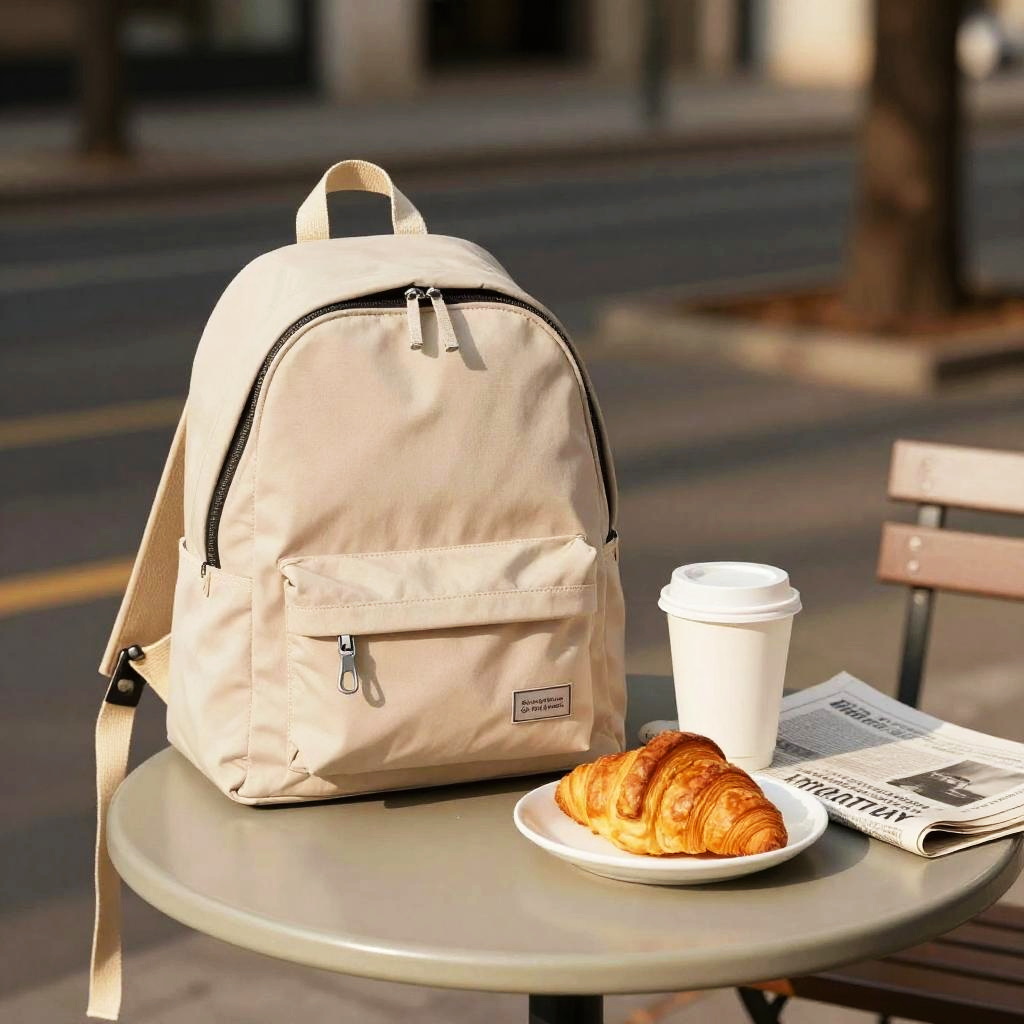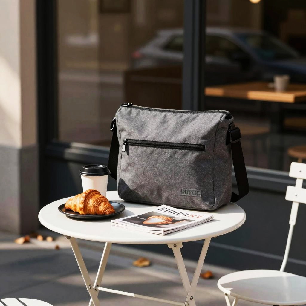 Photograph of a street scene with a gray canvas messenger bag standing upright on a small white metal table. The table has a croissant on a black plate, a white coffee cup with a black lid, and a magazine. The background is a dark storefront window with blurred reflections. Sunlight casts shadows, adding depth to the image. Fallen leaves are scattered on the ground.