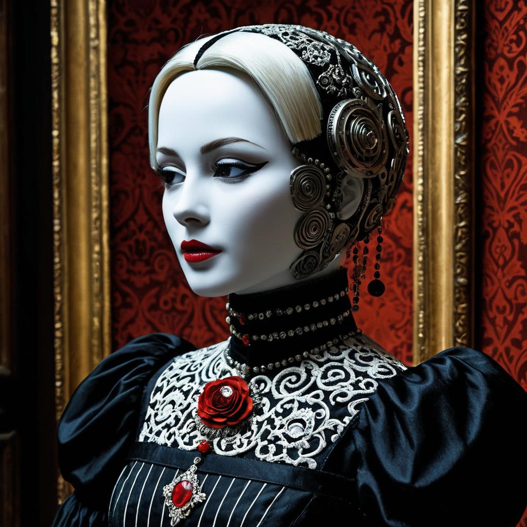 Realistic vibrant waist-up side view portrait of a mysterious AI haunted Annabelle doll cyborg. The subject features a pale, smooth face with striking red lips and sharp winged eyeliner. The doll is adorned with intricate baroque and gothic embellishments on a black dress with detailed lace patterns and puffed sleeves. The headpiece is decorated with metallic mechanical parts and hanging beads, adding surreal and complex elements to the composition. The background is a richly textured dark red damask wallpaper framed with gold molding.