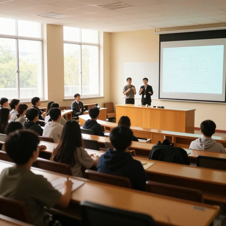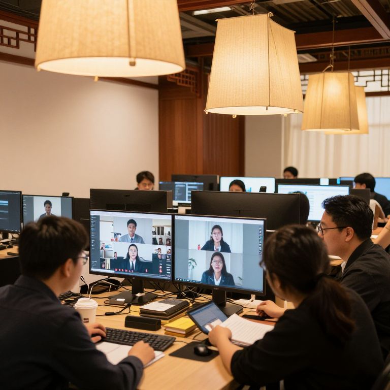 Asian office with traditional elements mixed with modern tech, paper scrolls hanging beside digital monitors, staff engaged in video conference, warm tones and organized workspace
