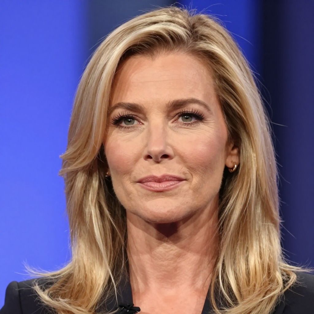 Photograph of a smiling blonde woman with light blue eyes, wearing a black top, against a blue background. She has straight, shoulder-length hair and