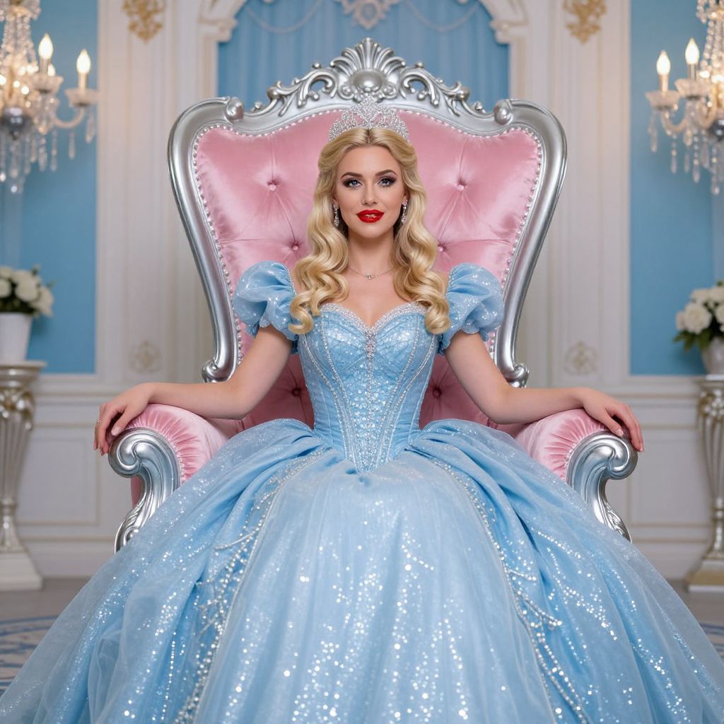 Photograph of a blonde woman with wavy hair, wearing a sparkling, light blue ball gown with puffed sleeves and a fitted corset. She sits regally on an ornate, silver and pink velvet throne in a luxurious, blue-hued room with chandeliers and elegant decor. Her makeup is glamorous, with bold red lipstick. The background is softly lit, enhancing the fairy tale ambiance.