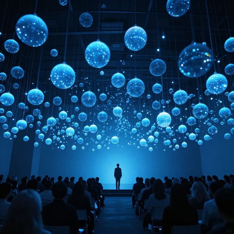 A solitary figure stands before an audience in a cavernous hall where countless glowing orbs float serenely above, casting an ethereal blue light that defies gravity and transforms the scene into a mesmerizing, otherworldly spectacle.